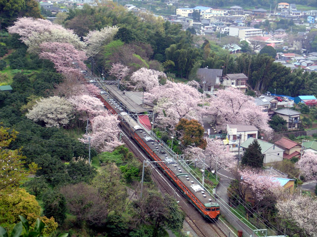 桜が満開の伊豆多賀駅を発車する東京から直通の普通列車 113系